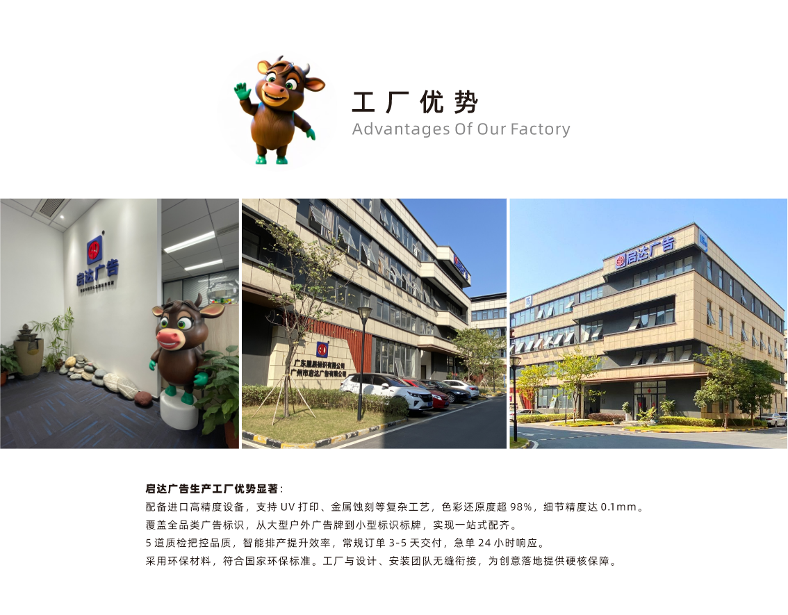 這些案例的背后,是啟達廣告全流程的專業服務體系。從前期的現場勘測、方案設計,到中期的精密制作、安全施工,再到后期的定期維護、售后響應,我們以 “一站式服務” 讓客戶全程無憂。作為源頭廠家,我們從原材料采購到生產工藝把控都親力親為,既保證了產品質量的穩定性,又能通過規模化生產為客戶提供高性價比的解決方案。?